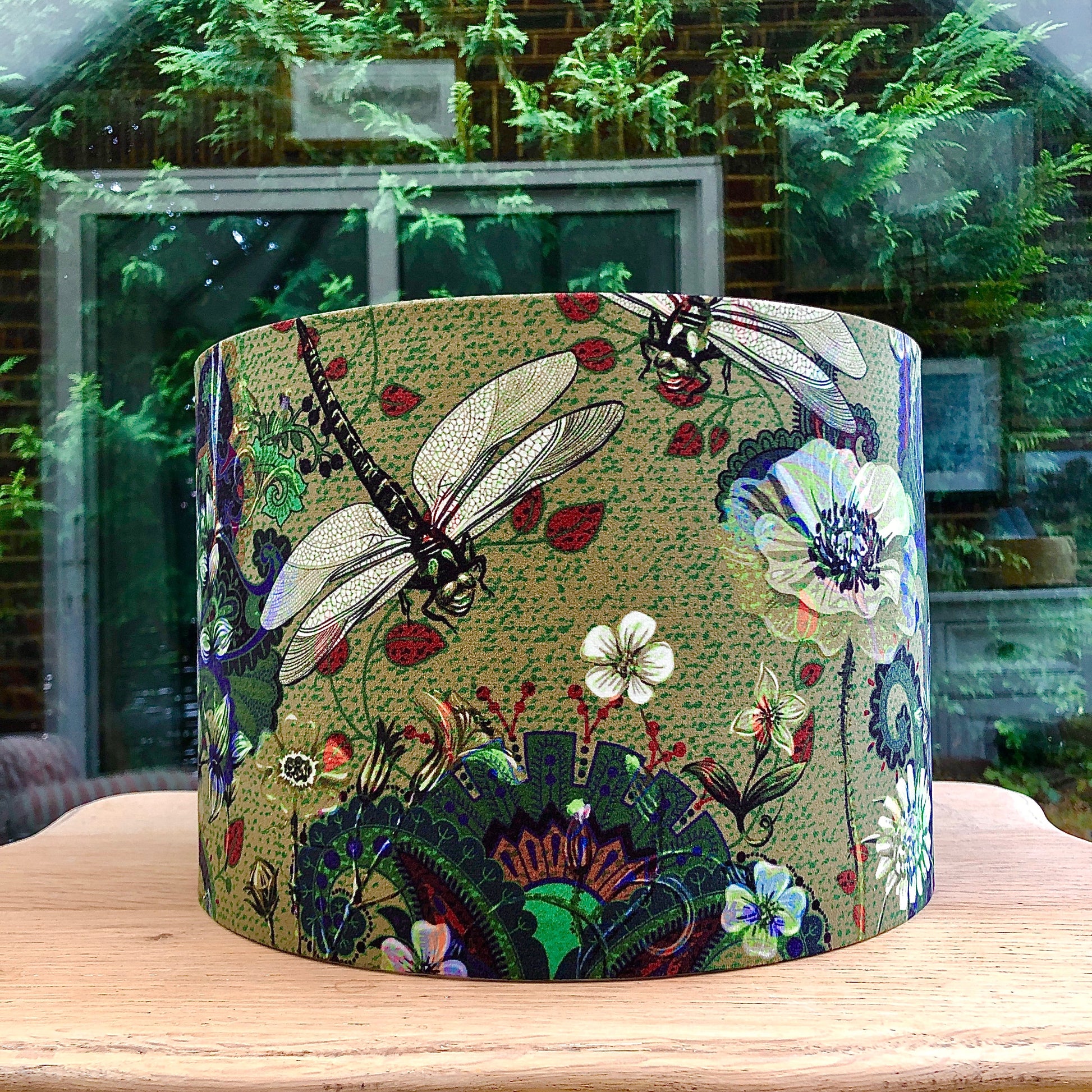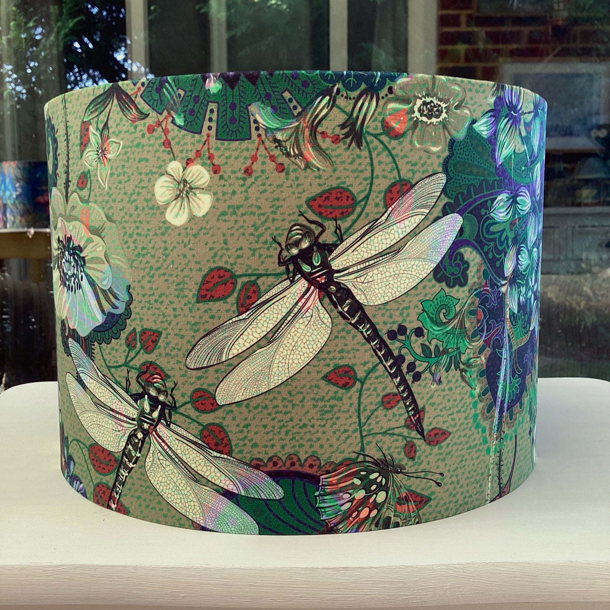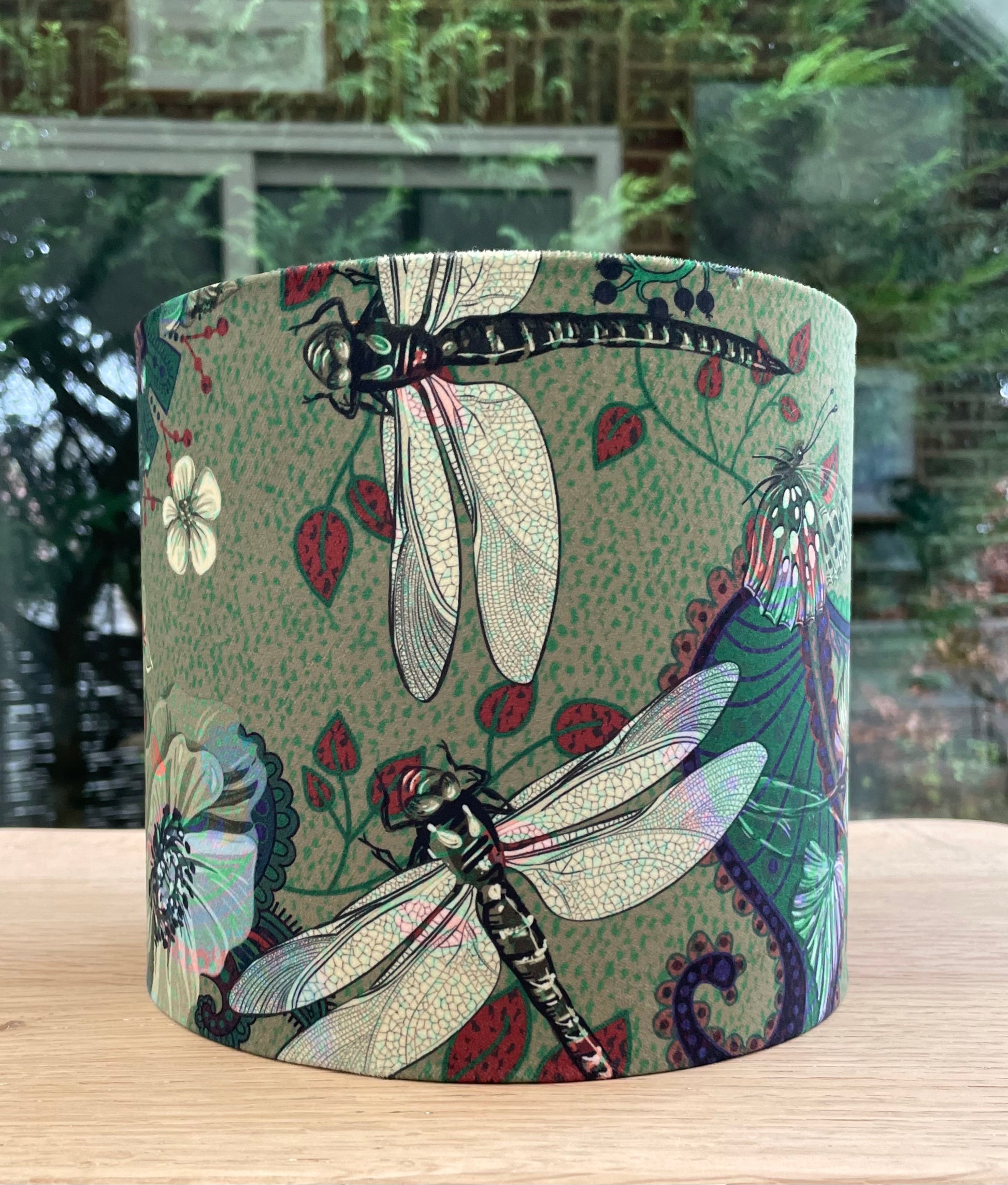 Handmade velvet lampshade lampshade featuring a nature-inspired fabric design with detailed butterflies, dragonflies and floral elements. The background is a soft green with a dotted texture, while the pattern includes intricate botanical elements in shades of green, red, and blue, giving it a whimsical and elegant look. The dragonflies are carefully illustrated with transparent wings and intricate line work, adding a sense of realism and charm. This lampshade would be ideal for bringing a touch of nature and a sophisticated aesthetic to any room, making it a perfect piece for nature lovers and those who appreciate intricate patterns in their home decor.