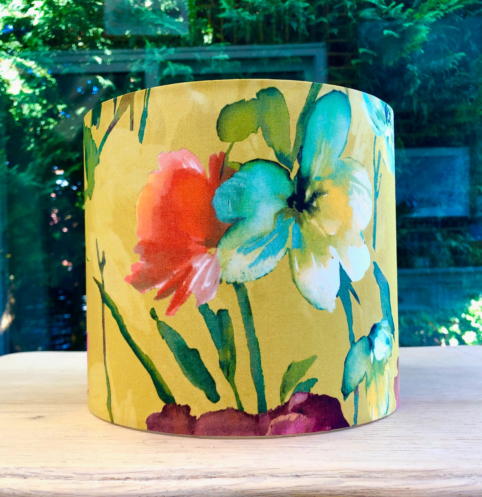Handmade lampshade showcases a stunning meadow-inspired floral pattern in vibrant hues of red, pink, blue, and green against a warm mustard-yellow background. The luxurious fabric adds a rich texture, creating a cozy, inviting atmosphere. Perfect for adding a splash of color and a touch of elegance to any room, this lampshade suits both modern and vintage-inspired interiors. Ideal as a statement piece for those who appreciate nature-inspired decor!