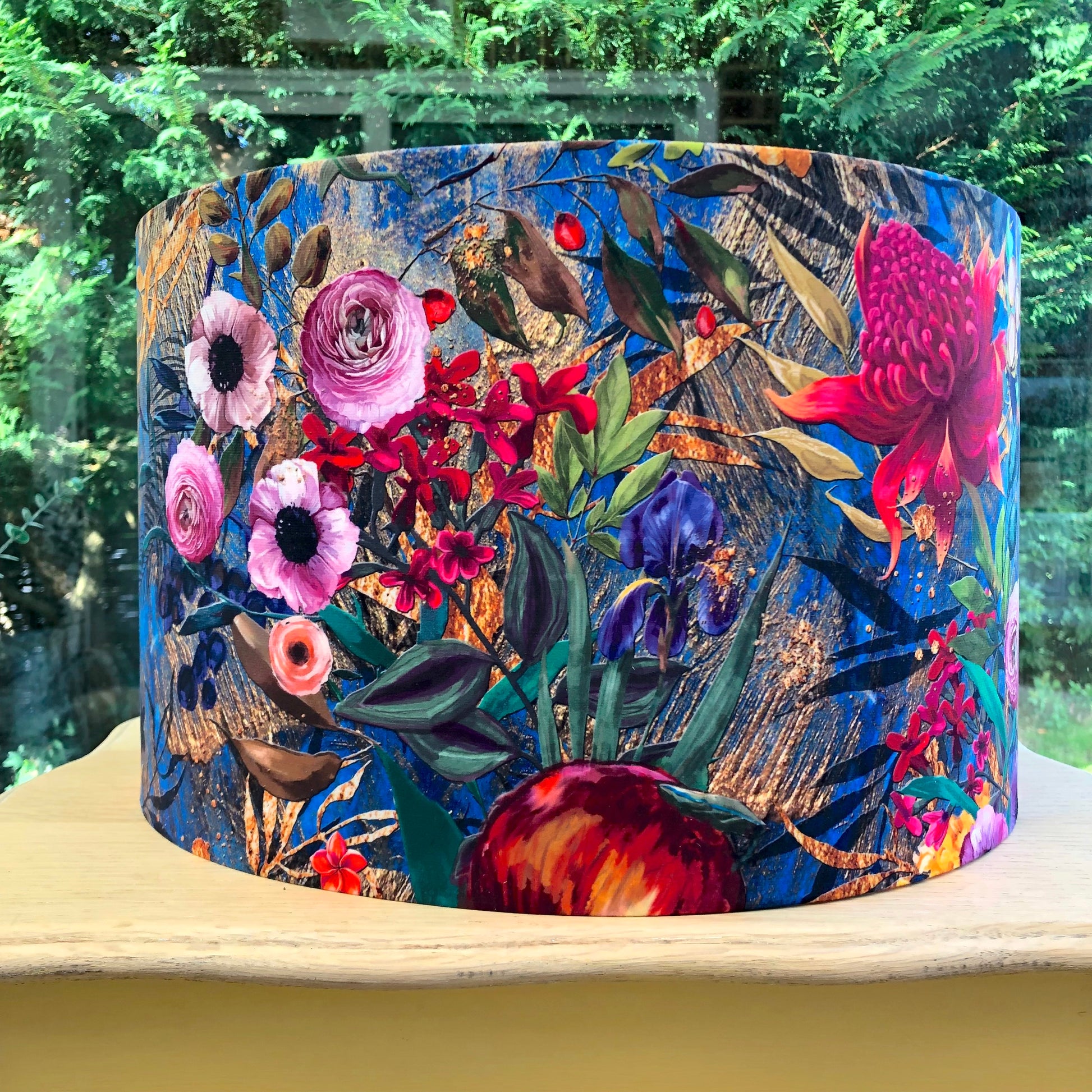 Handmade velvet lampshade lampshade features a striking, vibrant design with a rich blue background that resembles a textured, abstract canvas. The pattern is filled with an array of colourful flowers, and foliage, creating a lively and lush scene. Shades of pink, purple, green, and orange bring a bright, tropical feel, while the intricate details in the petals and wings add a sense of depth and realism. This bold lampshade would make a statement in any room, adding a touch of artistry and an exotic, nature-inspired flair, perfect for those who love vibrant colours and intricate floral motifs in their home decor.