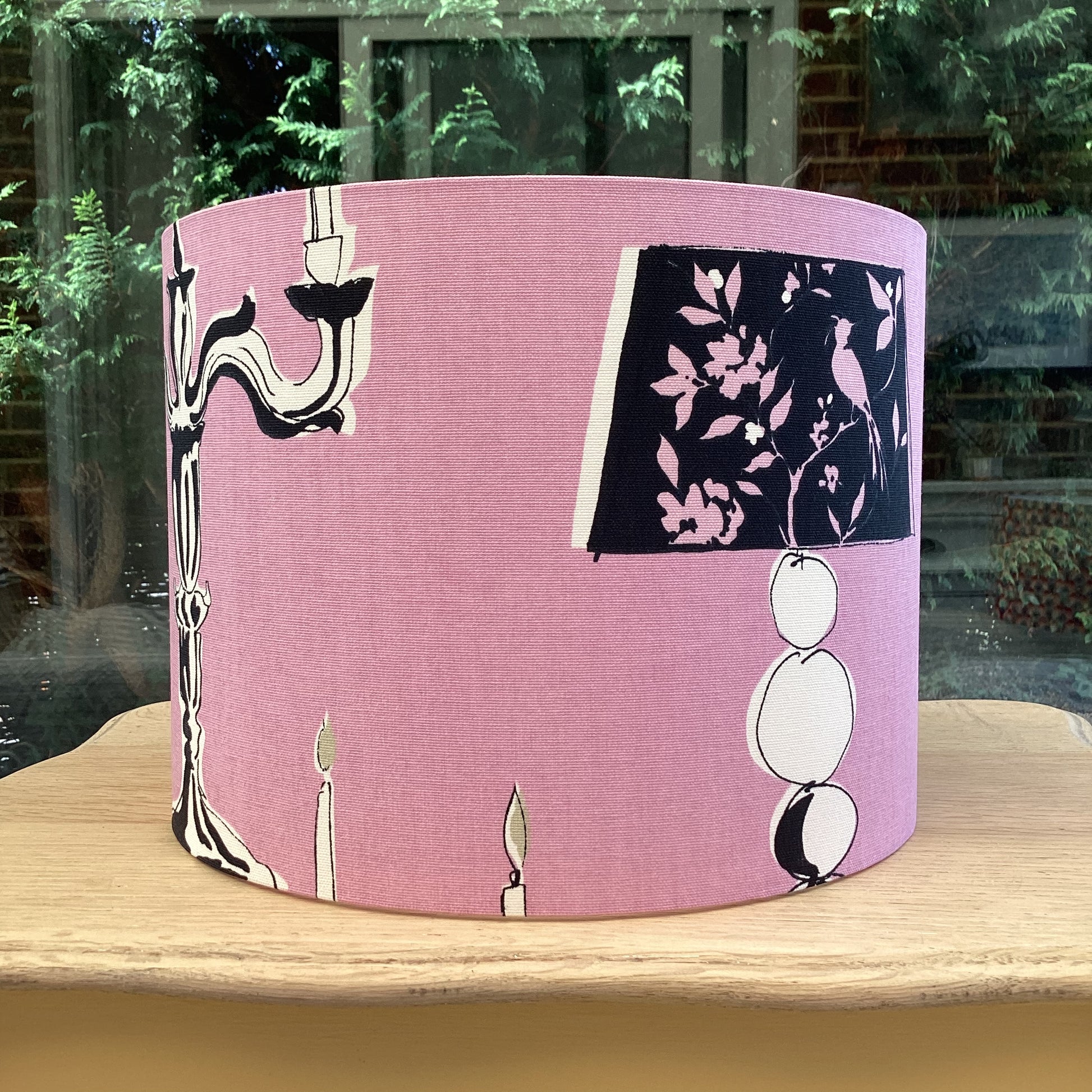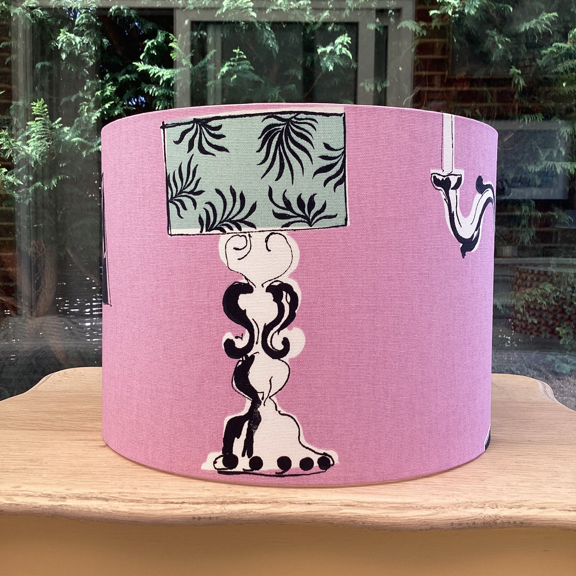 This lampshade brings instant mid-century glamour with a playful twist. Illustrated candlesticks and chic silhouettes dance across a blush-pink backdrop, creating a look that’s both whimsical and sophisticated. The bold black-and-white detailing recalls the effortless elegance of Parisian cafés, while the romantic pink hue nods to the timeless glamour of Breakfast at Tiffany’s. Perfect for adding a touch of cinematic charm to any room, it’s a statement piece that feels equal parts stylish apartment in Paris and Audrey Hepburn’s New York.