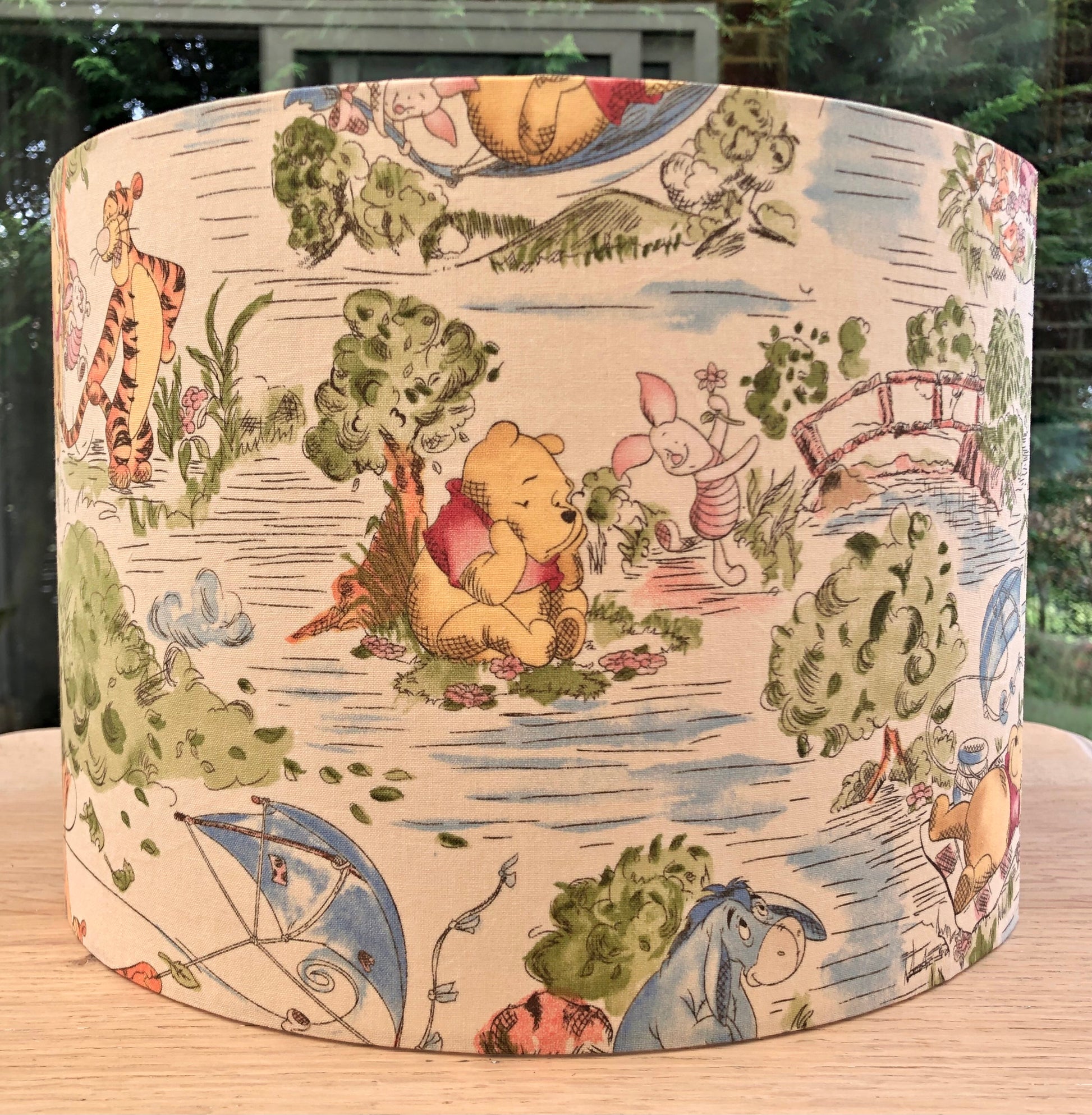 Handmade lampshade featuring classic Winnie the Pooh illustrations inspired by E.H. Shepard’s original artwork. The design showcases Pooh, Piglet, and Rabbit in a charming outdoor scene, with soft pastel colours and delicate linework that capture the nostalgic feel of the beloved storybook.